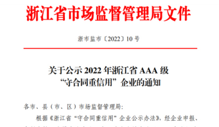 浙坤蝉联省AAA级“守合同重信用”企业称号