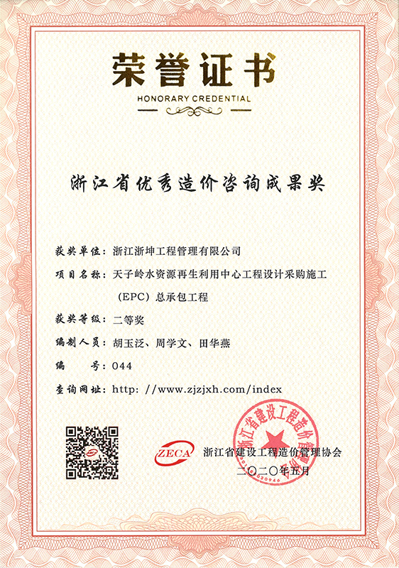 2020年天子岭水资源再生利用中心工程设计采购施工(EPC)总承包工程浙江省优秀造价咨询成果二等奖
