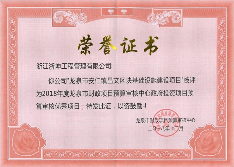 2018年”龙泉市安仁镇昌文区块基础设施建设项目“被评为龙泉市财政项目预算审核中心政府投资项目预算审核优秀项目