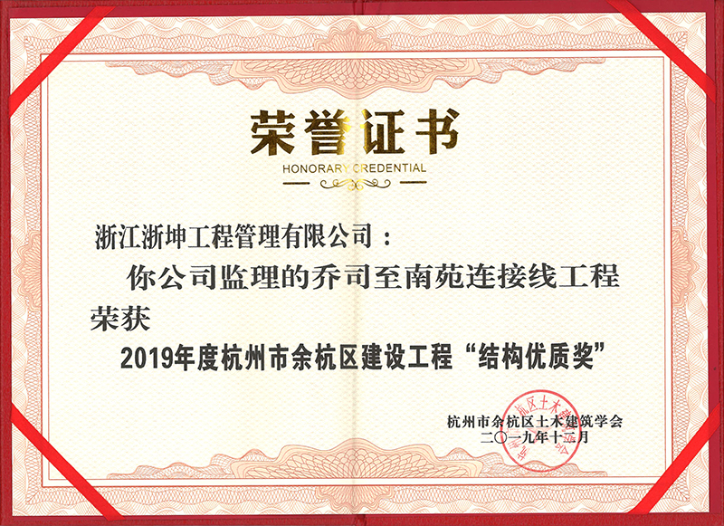 2019年乔司至南苑连接线工程荣获杭州市余杭区建设工程”结构优质奖“