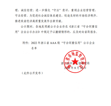 近日,浙江省市场监督管理局发布《关于公示2022年浙江省AAA级“守合同重信用”企业的通知》,华体网页版凭借良好的市场信誉和优质的管理服务,顺利通过各级市场监管部门严格的审核程序荣登榜单,再次被续展评定为AAA级“守合同重信用”企业。